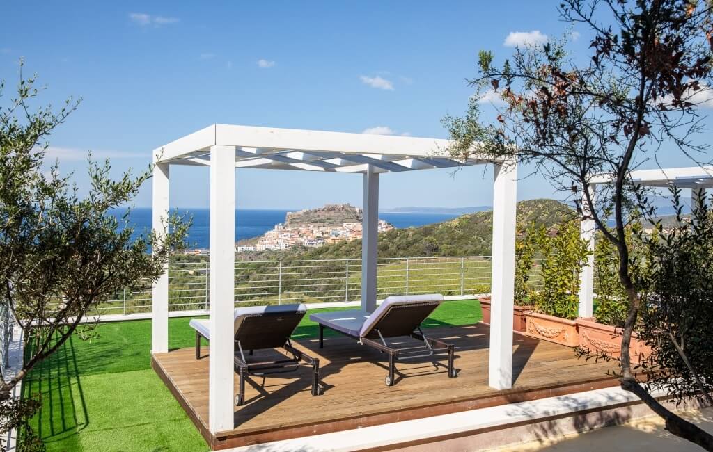Jedes Zimmer bietet einen Blick auf die umliegende Landschaft, zwischen grünen Hügeln und dem Meer.